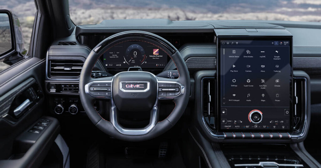 En tecnología y confort, la experiencia es de “tope de gama” de verdad. Al frente hay una pantalla táctil de 16.8 pulgadas con el sistema GMC Premium Infotainment e integración de Google, más compatibilidad con Apple CarPlay y Android Auto inalámbricos. La interfaz es rápida y la pantalla grande permite mapas y menús con buena lectura, algo útil cuando vas navegando entre salidas de la I-75 o buscando estacionamiento cerca de St. Armands. Suma un head-up display de 15 pulgadas que proyecta información clave, y un espejo retrovisor con cámara trasera que, cuando llevas pasajeros o carga alta, se vuelve más que un “gadget”: mejora la visibilidad real.