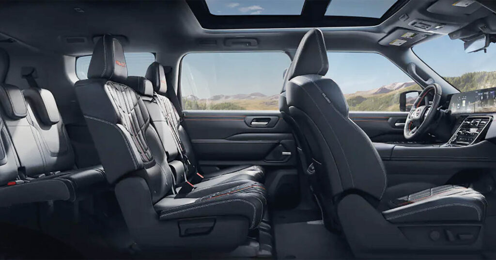 La unidad que probé venía configurada en color Deep Ocean Blue con interior charcoal y el paquete PRO-4X Premium, una combinación que le da una presencia bastante imponente desde el primer vistazo. Los detalles exteriores ayudan mucho a reforzar ese carácter robusto: rines de 20 pulgadas con neumáticos todo terreno, ganchos de remolque en rojo lava al frente, placas metálicas de protección en la parte inferior y una parrilla exclusiva para esta versión. No es un SUV que pase desapercibido cuando lo ves estacionado frente a un restaurante o entrando a un estacionamiento cerca del downtown.